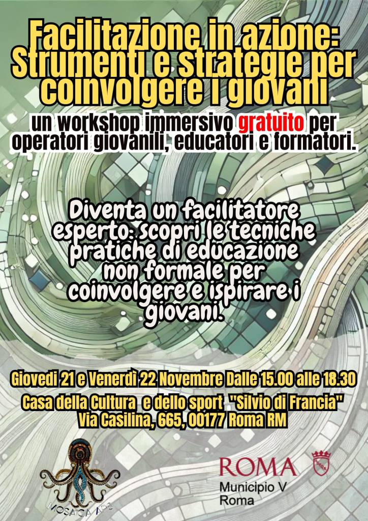 📍 21 e 22 novembre 2024 – Due giorni di esperienza immersiva nella facilitazione presso la Casa della Cultura e dello Sport “Silvio Di Francia”, nel cuore del V Municipio di Roma Capitale.