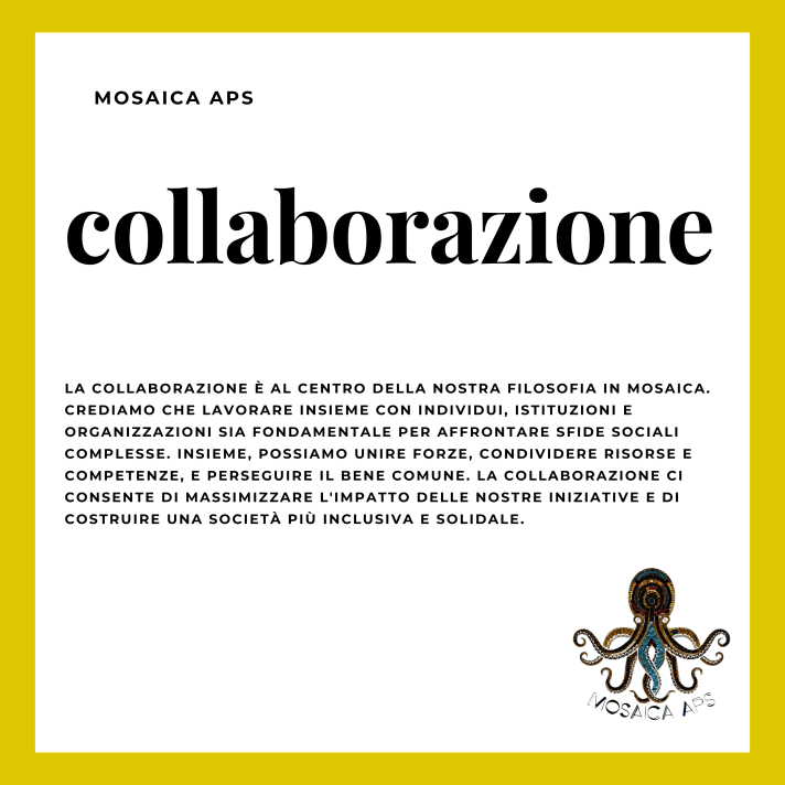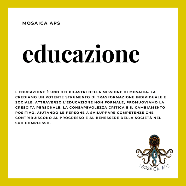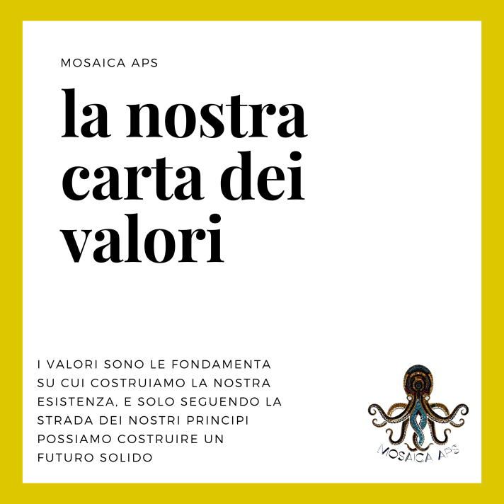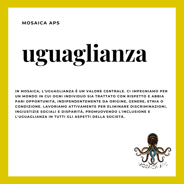 I valori di Mosaica sono il fondamento su cui costruiamo la nostra missione e il nostro impegno per un mondo migliore e più inclusivo. Sono i principi guida che plasmano ogni nostra azione e orientano le nostre decisioni. Ecco una descrizione dettagliata dei nostri valori:Uguaglianza: Crediamo in un mondo in cui ogni individuo ha pari opportunità e dignità. Questo valore sottolinea l’importanza di eliminare le barriere che impediscono alle persone di raggiungere il loro pieno potenziale. Significa combattere le discriminazioni, l’ingiustizia sociale e la disparità di trattamento. In un mondo basato sull’uguaglianza, ogni individuo ha accesso alle stesse opportunità di istruzione, lavoro, partecipazione alla vita sociale e politica e può esprimere se stesso senza paura di discriminazioni o pregiudizi. L’uguaglianza non è solo un obiettivo, ma anche un impegno attivo. Significa lavorare costantemente per creare una società più giusta, promuovere l’inclusione di gruppi svantaggiati e affrontare le disuguaglianze strutturali.