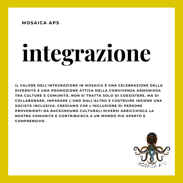 Integrazione: Favoriamo un’armoniosa convivenza tra culture e comunità. Questo valore si basa sulla comprensione che le differenze culturali e sociali possono arricchire una società invece di dividerla. Promuoviamo il dialogo interculturale, la comprensione reciproca e la collaborazione tra comunità diverse. Crediamo che l’integrazione sia fondamentale per creare una società inclusiva in cui le differenze sono celebrate e valorizzate.