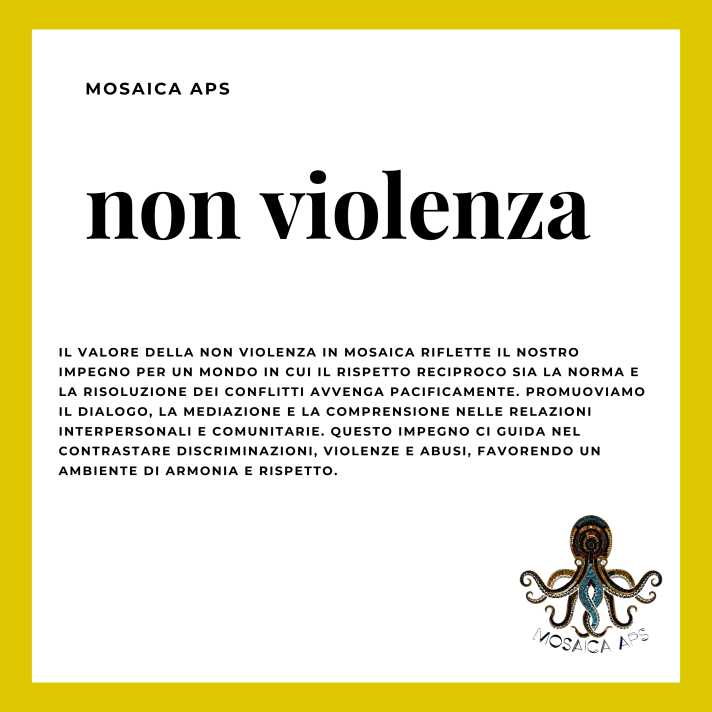 Non Violenza: Promuoviamo il rispetto reciproco e la risoluzione pacifica dei conflitti. La non violenza è il nostro approccio alla gestione dei conflitti e alla promozione della pace. Crediamo che il dialogo, la mediazione e il rispetto reciproco siano strumenti essenziali per risolvere le controversie e costruire un mondo in cui la violenza non ha spazio. Ci opponiamo a ogni forma di violenza, sia essa fisica o verbale, e ci impegniamo a promuovere la pace e il rispetto nei rapporti interpersonali e nella società in generale.
