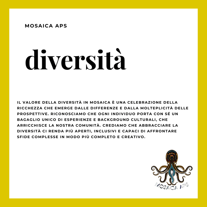 Diversità: Celebriamo la ricchezza delle differenze e la pluralità delle prospettive. Riteniamo che la diversità sia una risorsa preziosa che arricchisce la nostra società. Ogni individuo porta con sé un bagaglio unico di esperienze, culture e punti di vista. Abbracciando la diversità, siamo in grado di affrontare le sfide in modo più creativo e di creare soluzioni più inclusive. Promuoviamo l’apertura mentale, il rispetto per le differenze e la valorizzazione delle prospettive uniche. Questi valori sono al centro di tutto ciò che facciamo in Mosaica. Sono il motore che ci spinge a lavorare per un mondo più equo, inclusivo e pacifico.